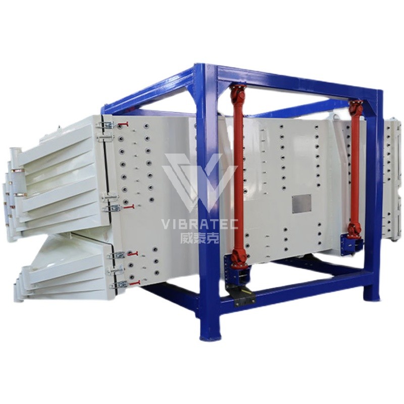 FYBS方形搖擺篩的工作原理為:篩機(jī)啟動后,篩機(jī)搖動體即篩箱在慣性力的作用下作前后往復(fù)運(yùn)動,篩箱帶動篩面作周期性搖動,從而使篩面上的物料隨篩箱一同作定向跳躍式運(yùn)動,期間,小于篩面孔徑的物料通過篩落到下層,成為篩下物,大于篩面孔徑的物料經(jīng) 連續(xù)翻滾跳躍運(yùn)動后從排料口排出,*終完成篩分工作。
